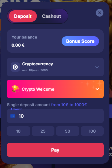 Players can fund their accounts using a variety of popular payment methods. Deposits may also qualify for casino bonuses. Deposit Options: Payment Methods: VISA, Mastercard, Bitcoin (BTC), Bank transfer, ApplePay, Litecoin (LTC), Binance Coin (BNB), Dogecoin (DOGE), Bitcoin Cash (BCH), Tether (USDT), Ethereum (ETH), USD Coin (USDC), Tron (TRX), PayOp, Google Pay. Minimum Deposit: 10 EUR Account Currencies: EUR, USD, AZN, KZT, RUB, UZS