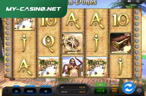 Video Slot 'Golden Dunes' ist ein 5x3 Spiel mit 25 Gewinnlinien. Die Hauptspielfunktionen umfassen: Wilds, Free Spins, Scatter Symbole, Substitutionssymbole, Pick Objects Bonusspiel, Bonussymbole, Free Spins Multiplikator, Spielhistorie.