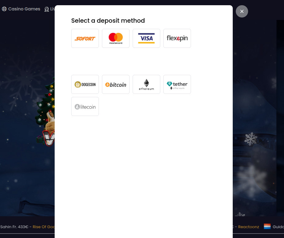 Spieler können ihre Konten mit einer Vielzahl beliebter Zahlungsmethoden aufladen. Einzahlungen können sich auch für Casino-Boni qualifizieren. Einzahlungsoptionen: Zahlungsmethoden: Sofort, Mastercard, Visa, Flexepin, Dogecoin, Bitcoin, Ethereum, Tether, Litecoin Mindesteinzahlung: 15 EUR Kontowährungen: NOK, EUR, USD, AUD, AZN, BRL, CAD, CHF, CLP, CZK, HUF, IDR, INR, KZT, MYR, NGN, NZD, PEN, PHP, PLN, SGD, THB, TRY, VND, ZAR