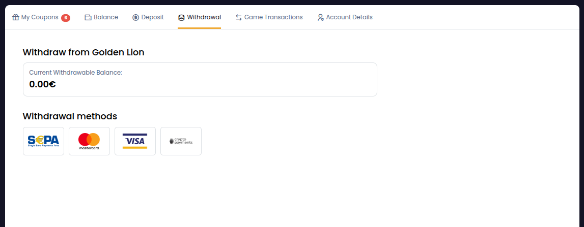 Die Auszahlung von Geldern von Golden Lion wird umgehend bearbeitet, wie von Spielerbewertungen bestätigt wird. Bearbeitungszeit: bis zu 24 Stunden. Auszahlungsmethoden: Sofort, Mastercard, Visa, Flexepin, Dogecoin, Bitcoin, Ethereum, Tether, Litecoin Limits: bis zu 1.000 EUR pro Tag Diese flexiblen und effizienten Optionen machen das Auszahlen schnell und problemlos.