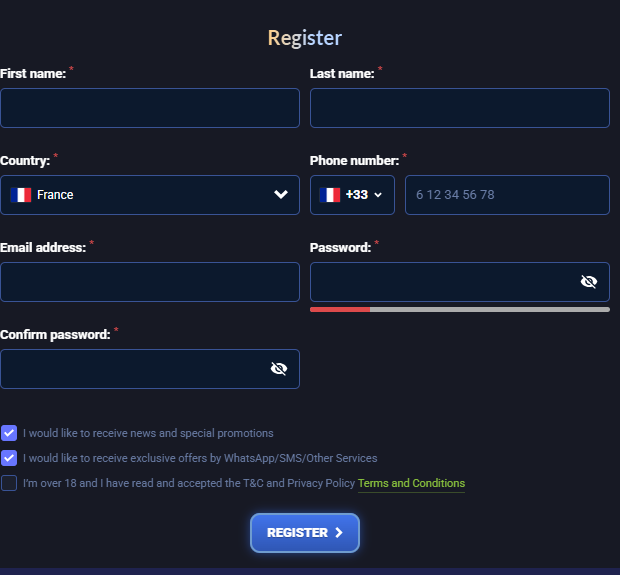 Registration at DiscoWin Casino is quick and involves one step: Create an account by providing: 1.Name Surname Country Phone number Email address Password Password confirmation