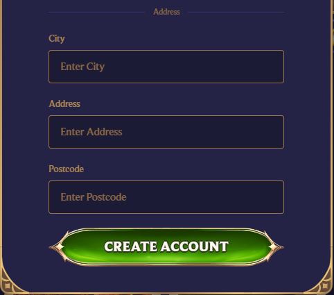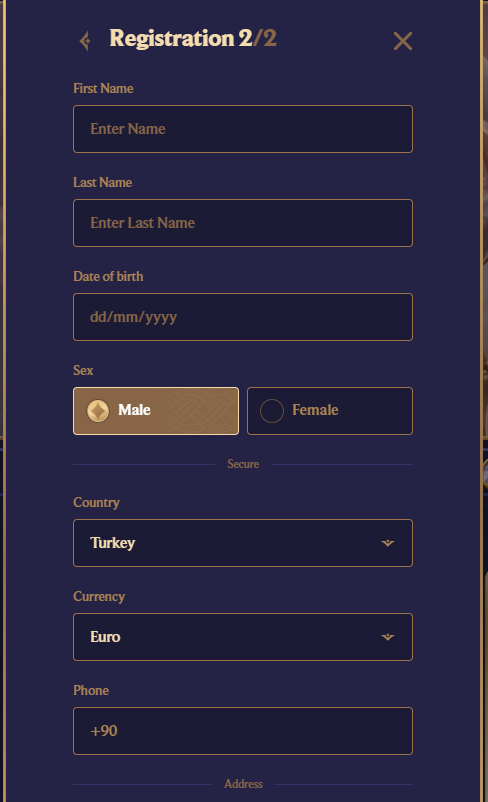 Registration at DivaSpin is quick and involves two steps: Step 1. Start creating an account by providing: Email Password Step 2. Finish creating an account by providing: Name Surname Date of birth Gender Country Currency Phone City Address Postcode