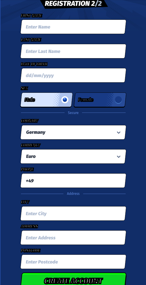 El registro en BigClash es rápido e implica: Paso 1. Cree una cuenta proporcionando: Dirección de correo electrónico Contraseña País Moneda Paso 2. Nombre Apellido Fecha de nacimiento Sexo País Moneda Número de teléfono Dirección Código postal Una vez que su cuenta esté configurada, puede depositar fondos y comenzar a jugar con dinero real. Inicie sesión con su nombre de usuario y contraseña.