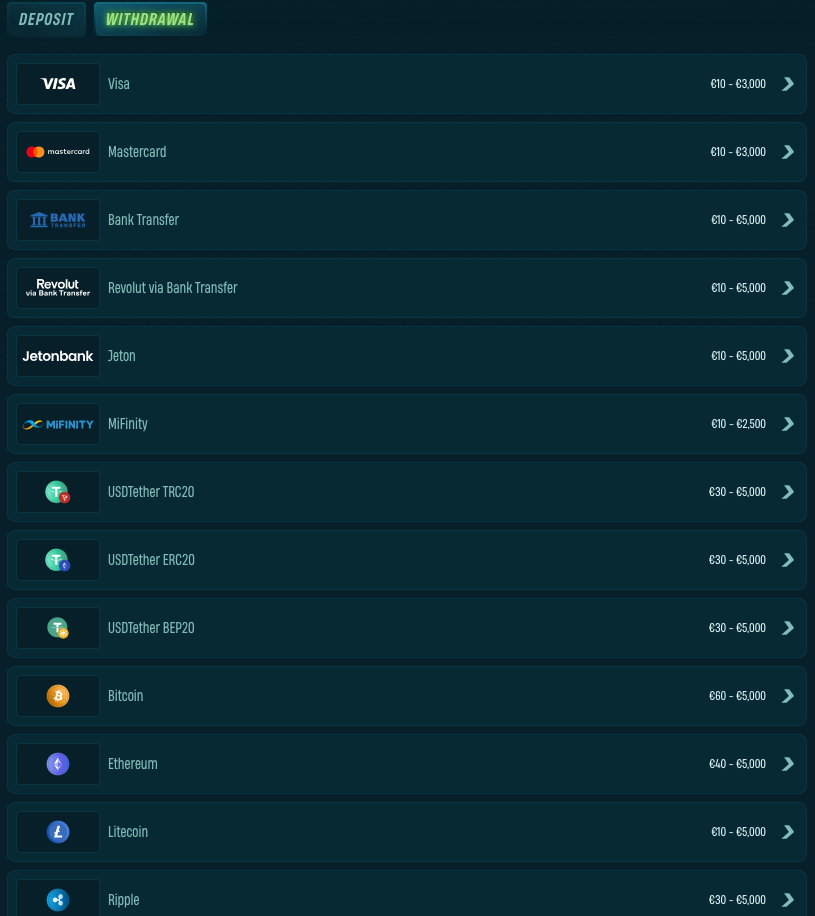 Los jugadores pueden fondear sus cuentas utilizando una variedad de métodos de pago populares. Los depósitos también pueden calificar para bonos de casino. Opciones de Depósito: Métodos de Pago: Mastercard, Jeton, MiFinity, Tether, Bitcoin, Ethereum, Litecoin, Ripple, USD Coin, BitcoinCash, Dogecoin, Cardano Depósito Mínimo: 10 EUR Monedas de la Cuenta: EUR, USD