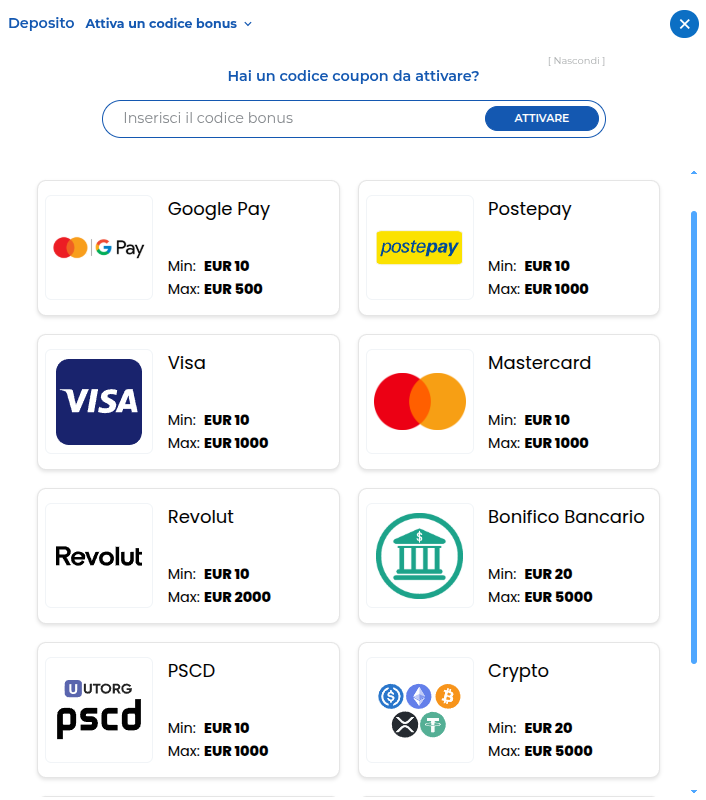 Players can fund their accounts using a variety of popular payment methods. Deposits may also qualify for casino bonuses. Deposit Options: Payment Methods: Skrill, Neteller, PaySafeCard, PayZ, Mastercard, Visa, Bitcoin, Bank Wire Transfer, Rapid Transfer, Revolut, MiFinity, Interac, Volt, USD Coin, Solana, Tether, Ethereum, BNB, Cardano, BitcoinCash, Dogecoin, Litecoin, Ripple Minimum Deposit: 20 EUR Account Currencies: TRY, EUR, USD, GBP, AED, ARS, BHD, BND, BRL, CAD, CHF, CLP, CNY, COP, CZK, DKK, HKD, HUF, IDR, INR, JPY, KRW, KWD, MAD, MXN, MYR, NGN, NOK, NZD, OMR, PEN, PHP, PKR, PLN, PYG, QAR, SAR, SGD, SZL, THB, TMT, TND, TTD, TWD, UAH, UYU, VND, ZAR