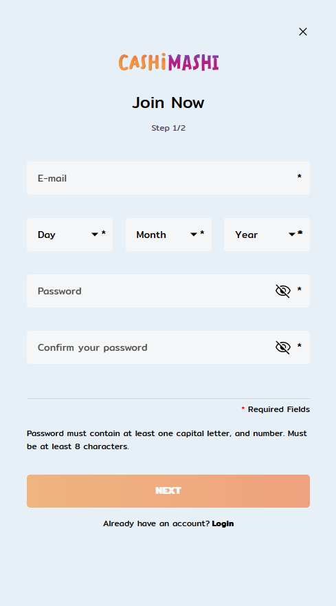 L'inscription sur CashiMashi est rapide et ne comprend qu'une seule étape : Créez un compte en fournissant : Adresse e-mail Date de naissance Mot de passe Confirmation du mot de passe Nom Nom de famille Nom d'utilisateur Adresse Code postal Ville Pays Devise Numéro de téléphone