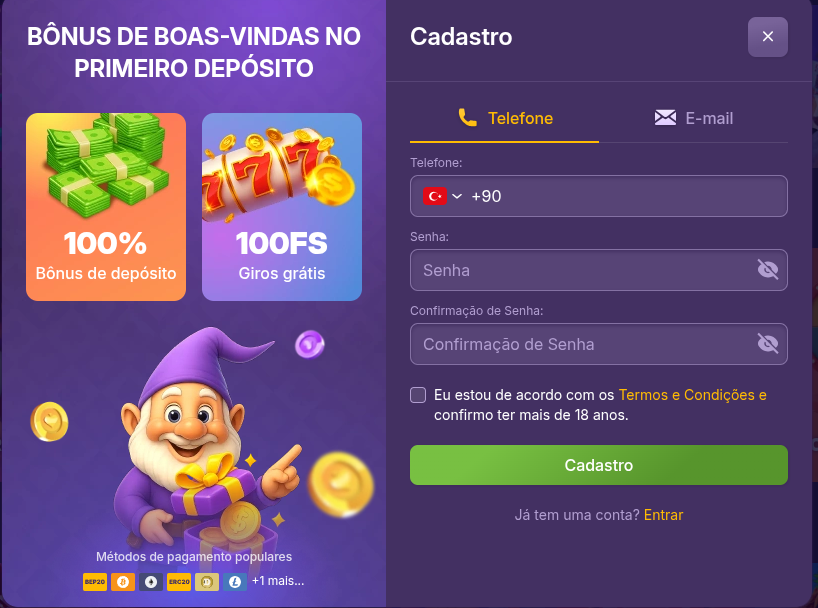 L'inscription sur Gold.casino est rapide et implique : Créer un compte en fournissant : Numéro de téléphone Mot de passe Confirmation du mot de passe Confirmer que vous avez 18 ans ou plus Vous pouvez vous inscrire en utilisant votre numéro de téléphone ou votre adresse e-mail Une fois votre compte créé, vous pouvez déposer des fonds et commencer à jouer pour de l'argent réel. Connectez-vous en utilisant votre nom d'utilisateur et votre mot de passe.