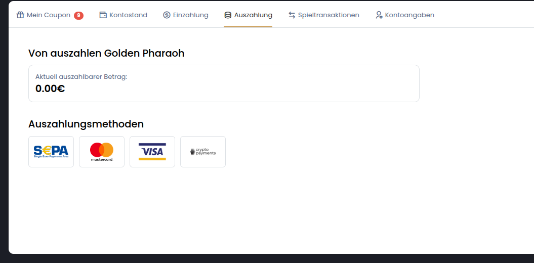 Funds withdrawal from Golden Pharaoh is processed promptly, as confirmed by player reviews. Processing Time: up to 24 hours. Withdrawal Methods: Skrill, Neteller, PaysafeCard, VISA, Mastercard, Sofort Banking, Przelewy24, Neosurf, Bitcoin (BTC), Bank transfer, Flexepin, Instant Bank Transfer, Cashlib, Pay With Click, Ethereum (ETH), Litecoin (LTC), WebPayz, Dogecoin (DOGE), Tether (USDT), SEPA, PIX, Revolut Limits: up to 5,000 EUR per week These flexible and efficient options make cashing out quick and hassle-free.