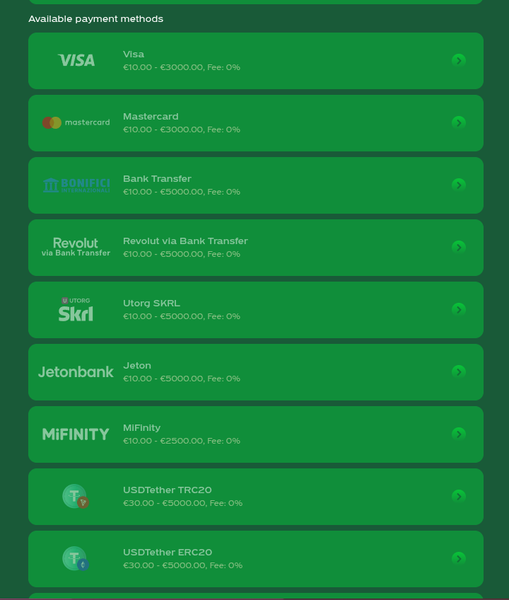 Players can fund their accounts using a variety of popular payment methods. Deposits may also qualify for casino bonuses. Deposit Options: Payment Methods: Neteller, Skrill, PaySafeCard, Mastercard, Visa, Neosurf, Postepay, Zimpler, Siru Mobile, Bank Transfer, Interac, Jeton, CashtoCode, Rapid Transfer, MiFinity, Cardano, Litecoin, Ethereum, Dogecoin, Tether, Revolut, Ripple, USD Coin, BitcoinCash Minimum Deposit: 10 EUR Account Currencies: NOK, EUR, USD, AUD, CAD, CHF, CLP, CZK, HUF, NZD, PEN, PLN