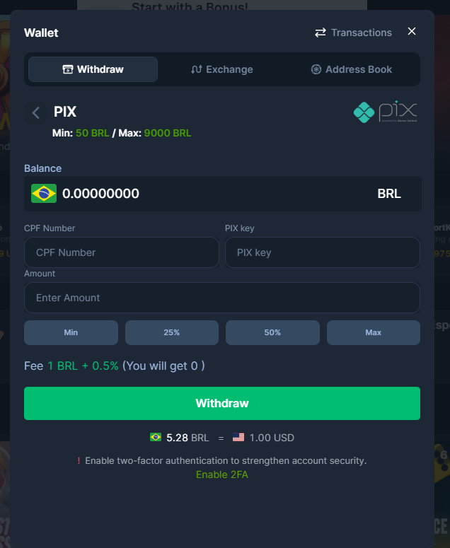 I giocatori possono finanziare i propri conti utilizzando una varietà di metodi di pagamento popolari. I depositi possono anche essere idonei per i bonus del casino. Opzioni di Deposito: Metodi di Pagamento: VISA, Mastercard, Bitcoin (BTC), AstroPay, Bonifico bancario, SkinsBack, Revolut, bKash, m10, WebPay, PAGO46, Multicaja, Rocket, Nagad, Interac, PIX, SU RED, Efecty, Unified Payments Interface (UPI), TPAGA, Khipu, Mach, PSE - Pago Seguros En Linea, klap, OXXO, Codi, Papara, blik, Mpesa, PhonePe, SPEI, Kaspi, OTP Bank, Pumb, МИР - Mir, SwiffyEft, CEP bank, Aninda Mefete, monobank, PrivatBank, Polkadot, Dogecoin (DOGE), Litecoin (LTC), Ethereum (ETH), Bitcoin Cash (BCH), Cardano (ADA), Binance Coin (BNB), USD Coin (USDC), Tron (TRX), Ripple (XRP), Tether (USDT), Shiba Inu (SHIB), Polygon (MATIC), Toncoin (TON), Solana (SOL). Deposito Minimo: 25 BRL Valute Account: EUR, USD, ADA, AUD, AZN, BCH, BDT, BNB, BRL, BTC, CAD, CLP, CNY, COP, DOGE, ETH, GEL, IDR, INR, JPY, KES, KZT, LTC, MXN, MYR, NGN, NZD, PEN, PHP, PLN, RUB, SOL, THB, TRX, TRY, UAH, USDC, USDT, UZS, XRP, ZAR