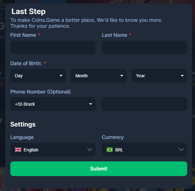 La registrazione a Coins.Game è rapida e prevede due passaggi: Passaggio 1. Inizia a creare un account fornendo: Email Password Passaggio 2. Completa la creazione di un account fornendo: Nome Cognome Data di nascita Numero di telefono Lingua Valuta