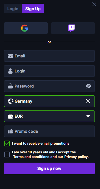 La registrazione su HashLucky è rapida e prevede un solo passaggio: Crea un account fornendo: Indirizzo email Username Password Paese Valuta [Promocode] (se ne hai uno) Puoi anche accedere tramite Twitch o Google