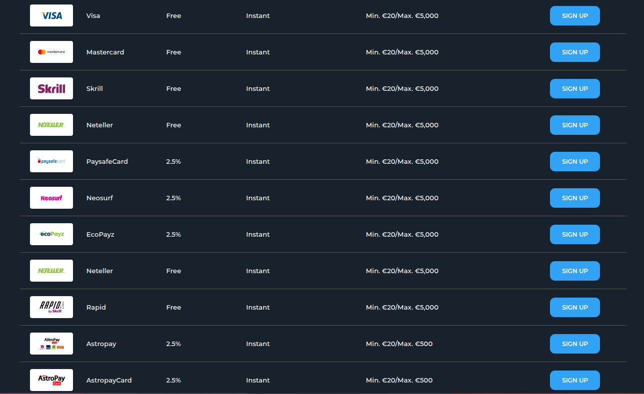 Players can fund their accounts using a variety of popular payment methods. Deposits may also qualify for casino bonuses. Deposit Options: Payment Methods: Skrill, Neteller, PaysafeCard, Payz (ecoPayz) , VISA, Mastercard, Neosurf, Maestro, Bitcoin (BTC), AstroPay, idebit, Bank transfer, Inpay, Bitcoin Cash (BCH), MiFinity, Coinspaid, UTORG, Bybit, Tether (USDT), Google Pay, Litecoin (LTC), Tron (TRX), Dogecoin (DOGE), Ethereum (ETH), CashtoCode, Pay4Fun, Rapid Transfer, MuchBetter, Interac, Ripple (XRP), Interac e-Transfer, Vega wallet JP, Directa24, Volt, Noda pay. Minimum Deposit: 20 EUR Account Currencies: NOK, EUR, USD, GBP, ADA, AUD, BCH, BNB, BRL, BTC, CAD, DOGE, ETH, HUF, INR, JPY, LTC, NZD, PLN, TRX, USDT, XRP, ZAR