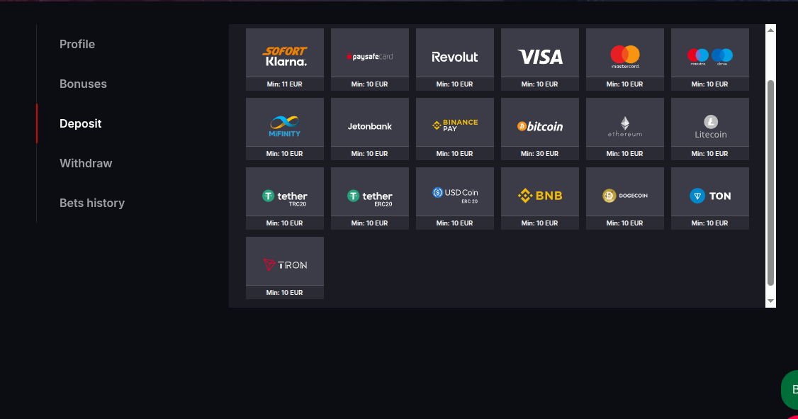 Os jogadores podem financiar as suas contas usando uma variedade de métodos de pagamento populares. Os depósitos também podem ser elegíveis para bónus de casino. Opções de Depósito: Métodos de Pagamento: Neteller, Skrill, PaysafeCard, VISA, Mastercard, Bitcoin (BTC), Dogecoin (DOGE), Litecoin (LTC), Ethereum (ETH), Tether (USDT), Rapid Transfer, USD Coin (USDC), MiFinity, Toncoin (TON), Tron (TRX), Binance Pay, Binance Coin (BNB) Depósito Mínimo: 10 EUR Moedas da Conta: NOK, EUR, USD, CHF, CLP, DKK, HUF, PLN, RON, SEK