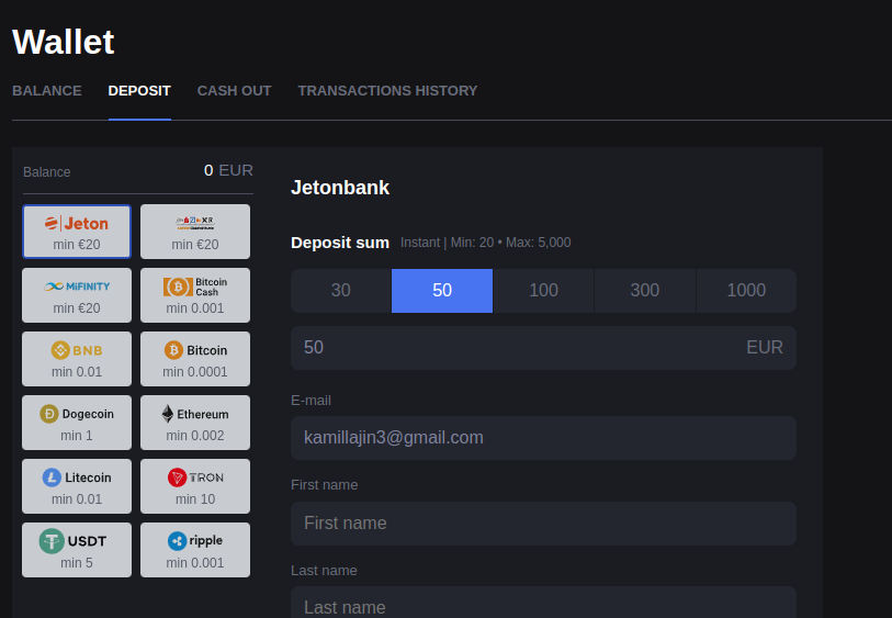 Players can fund their accounts using a variety of popular payment methods. Deposits may also qualify for casino bonuses. Deposit Options: Payment Methods: Skrill, Neteller, PaysafeCard, Payz (ecoPayz) , VISA, Mastercard, Sofort Banking, eps-Überweisung, Neosurf, Bitcoin (BTC), AstroPay, idebit, Siru Mobile, Bank transfer, ApplePay, Flexepin, Ethereum (ETH), Litecoin (LTC), Dogecoin (DOGE), Ripple (XRP), Tether (USDT), Tron (TRX), Coinspaid, CashtoCode, Bank of Ireland, Allied Irish Banks (AIB), ING Bank, Ulster Bank, Interac e-Transfer, Cashlib, Interac, MyBank, Jeton, PayID, eZeeWallet, Rapid Transfer, Binance Coin (BNB), VenusPoint, Cardano (ADA), MuchBetter, Pay4Fun, MiFinity, Bitcoin Cash (BCH). Minimum Deposit: 20 EUR Account Currencies:NOK, EUR, USD, ADA, AUD, BCH, BNB, BRL, BTC, CAD, DOGE, ETH, INR, JPY, LTC, NZD, PHP, PLN, TRX, USDT, XRP, ZAR