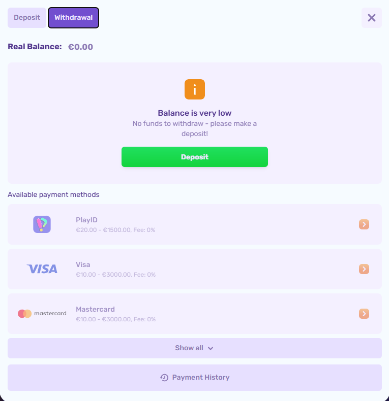 Players can fund their accounts using a variety of popular payment methods. Deposits may also qualify for casino bonuses. Deposit Options: Payment Methods: Neteller, Skrill, PaysafeCard, VISA, Mastercard, PostePay, Neosurf, Zimpler, Bitcoin (BTC), Siru Mobile, Bank transfer, Skrill 1-Tap, Ripple (XRP), Revolut, SafetyPay, Rapid Transfer, UTORG, USD Coin (USDC), Voucher, Tether (USDT), SticPay, WebPay, Bitcoin Cash (BCH), Fun ID, Ethereum (ETH), Interac, Cardano (ADA), blik, Dogecoin (DOGE), CashtoCode, MiFinity, MuchBetter, Khipu, Jetonbank, Mach, Litecoin (LTC). Minimum Deposit: 10 EUR Account Currencies: NOK, EUR, USD, AUD, BRL, CAD, CHF, CLP, CZK, HUF, INR, KRW, MYR, NGN, NZD, PEN, PHP, PLN, SGD, THB, ZAR