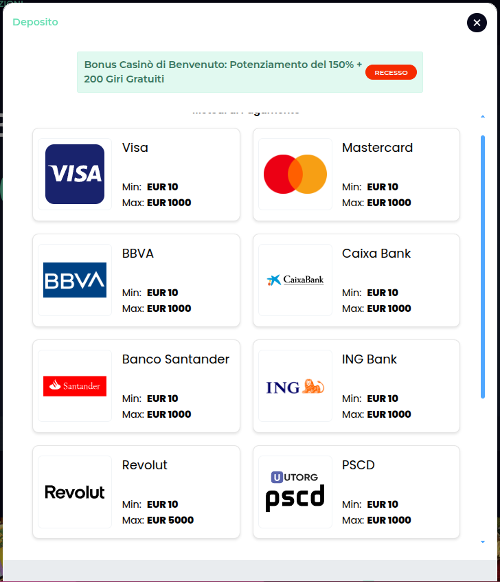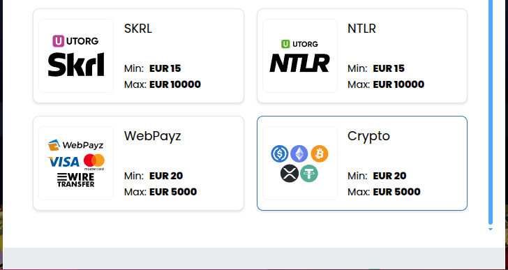 Oyuncular, çeşitli popüler ödeme yöntemlerini kullanarak hesaplarına para yatırabilirler. Para yatırma işlemleri casino bonusları için de uygun olabilir. Para Yatırma Seçenekleri: Ödeme Yöntemleri: Skrill, Neteller, PayZ, Mastercard, Visa, Bitcoin, Rapid Transfer, MuchBetter, Litecoin, Stellar, MiFinity, Interac, Tether Minimum Para Yatırma: 10 EUR Hesap Para Birimleri: EUR, USD, BRL, CAD, CHF, DKK, HUF, NOK, NZD