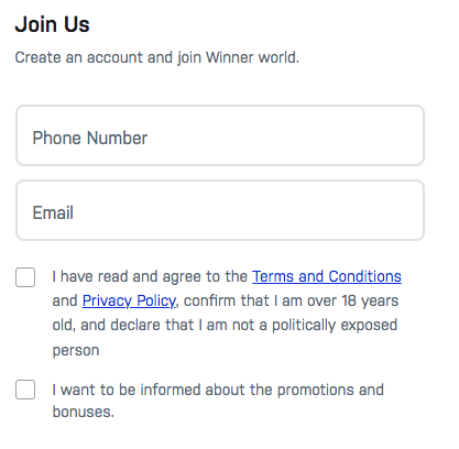 Registration at Winner-casino is quick and involves one step: Step 1. Create an account by providing: Email address Phone number Confirmation code Once your account is set up, you can deposit funds and start playing for real money. Log in using your username and password.
