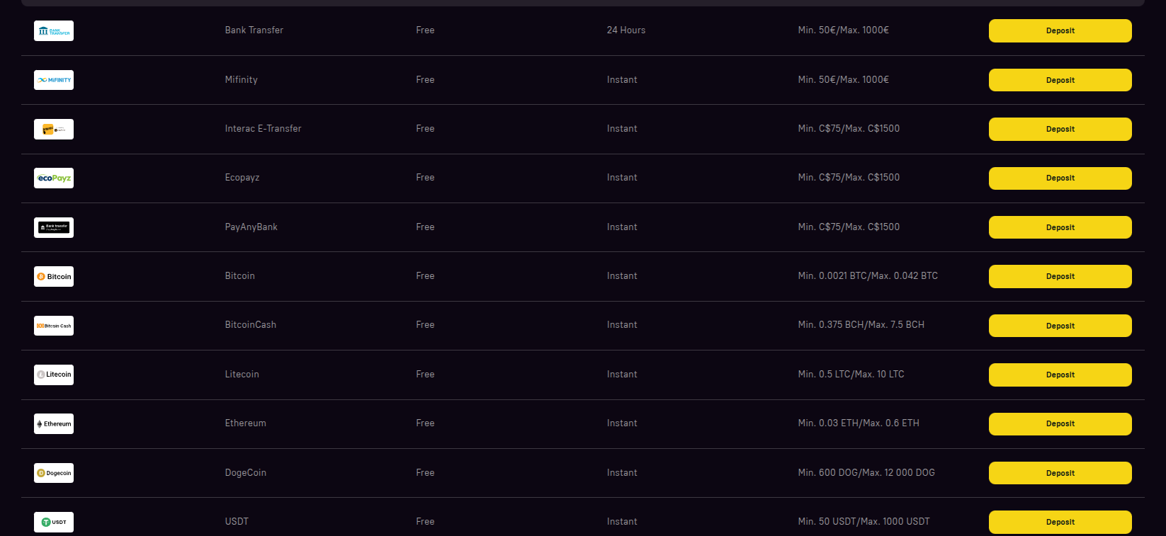 Players can fund their accounts using a variety of popular payment methods. Deposits may also qualify for casino bonuses. Deposit Options: Payment Methods: Skrill, Neteller, PaySafeCard, PayZ, Visa, Mastercard, Maestro, Neosurf, iDebit, Flexepin, Interac, MiFinity, eZeeWallet, Jeton, CashtoCode, MuchBetter, Revolut, Pay4Fun, Bitcoin, BitcoinCash, Litecoin, Ethereum, Dogecoin, Tether, PIX, Rapid Transfer Minimum Deposit: 20 EUR Account Currencies: NOK, EUR, USD, AUD, BCH, BTC, CAD, DOGE, ETH, JPY, LTC, NZD, USDT, ZAR